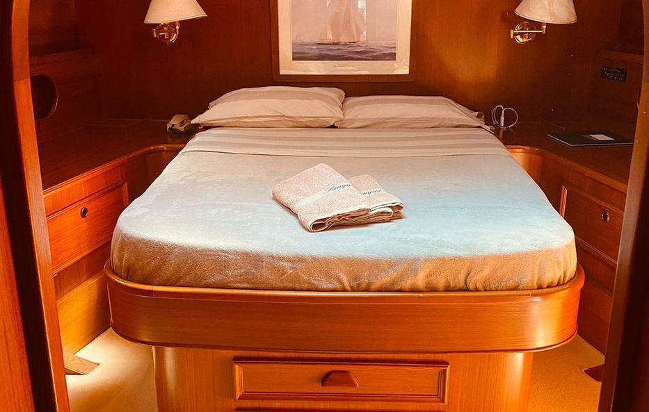 Cabina armatoriale a tutto baglio con bagno privato, bidet e doccia chiusa, con letto queen size.