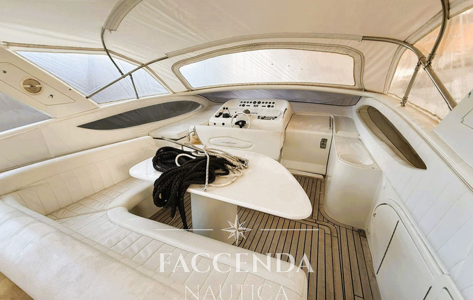 Ampi spazi esterni: prendisole a prua, zona living a poppa con tavolo centrale, cuscineria completa e pavimentazione in teak.