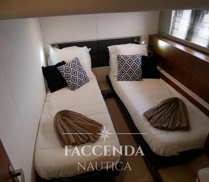 Gli interni spaziosi sono luminosi e moderni, con un hard top scorrevole e ampie vetrate sopra e sotto coperta. Il salone si apre armoniosamente sul ponte di poppa, dove gli ospiti possono cenare all'aperto grazie agli ampi posti a sedere, che si trasformano facilmente in un grande prendisole. Il ponte di prua offre un ulteriore prendisole doppio, mentre la piattaforma da bagno estesa consente un facile accesso all'acqua.