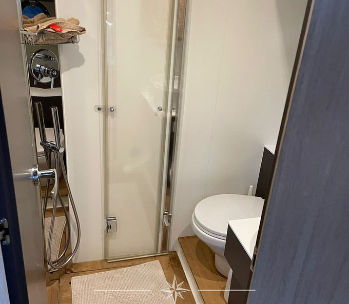 La cabina di poppa ospita tre posti letto e ha un bagno ensuite con doppia porta di accesso per l'uso giornaliero.
